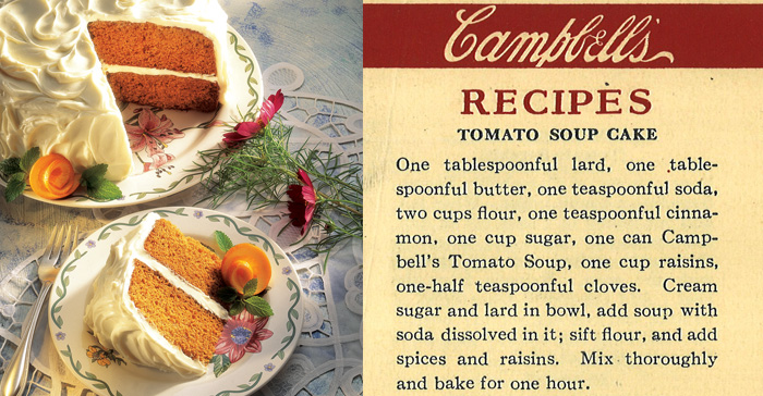 Największą popularność zyskało w latach sześćdziesiątych i siedemdziesiątych, kiedy Amerykanie w ogóle mieli różne dziwne kulinarne pomysły – to okres gotowych mieszanek do ciasta, barwników (pomyślcie choćby o słynnym Red Velvet Cake), kolorowych galaretek czy syfonów ze śmietaną. W 1960 roku to właśnie przepis na ciasto z zupy pomidorowej był pierwszym, który trafił na etykietkę puszki zupy Campbell’s. W kolejnych wydawanych przez firmę książkach kulinarnych pojawiają się przepisy na babeczki, serniki i babki z wykorzystaniem zupy, a ja – choć całym sercem popieram kulinarne eksperymenty – zastanawiam się jednak, czy subtelna nuta smakowa zawartego w niej oleju czosnkowego na pewno pozostaje niewyczuwalna.