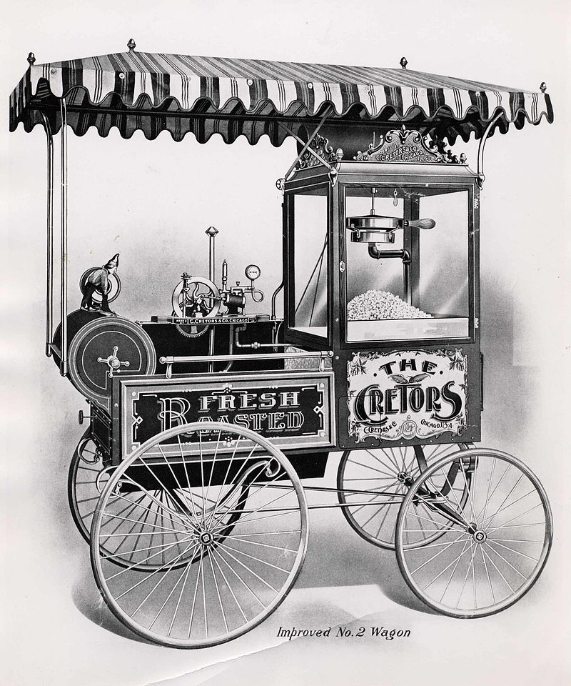 Na samym początku XX wieku Cretors przedstawił kolejny wynalazek – dużą maszynę na konnym wózku, która od razu stała się przebojem. Szybko wyczuł też, że świetnymi partnerami biznesowymi będą dla niego zdobywające coraz większą popularność kina, zapoczątkowując tym samym trwającą do dzisiaj intymną relację między prażoną kukurydzą i wielkim ekranem. Co ciekawe, od samego początku obecność jedzenia na sali kinowej budziła wątpliwości (do dziś część widzów narzeka przecież na kina, w których „cuchnie popcornem” i nie wyobraża sobie pogryzania podczas obcowania z wielką sztuką), a w kinach wieszano znaki nakazujące zostawiać w szatni nie tylko swoje palta, ale i – często nielegalnie przemycane – torebki z zakupionym na ulicy popcornem. Kiniarze przekonali się jednak do tego mariażu, kiedy okazało się, że można na kukurydzy zarobić więcej niż na biletach i sami zaczęli montować maszyny do prażenia w swoich salach.