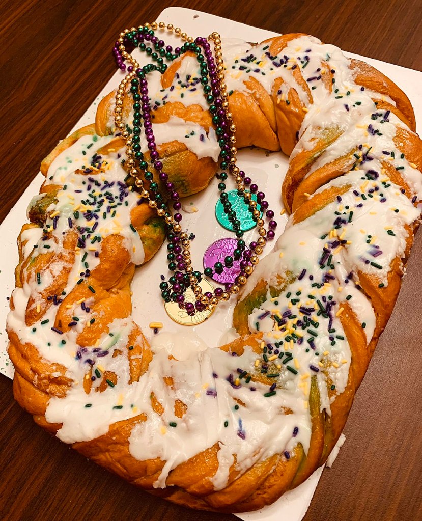Tradycja nowoorleańskiego King’s Cake wywodzi się od francuskiego galette de rois, pieczonego z okazji święta epifanii. W amerykańskiej wersji ciasto to cynamonowa strucla pokryta lukrem, często w tradycyjnie karnawałowych kolorach – fioletowym, zielonym i złotym. Zgodnie z europejską tradycją, w cieście ukryte jest plastikowe dzieciątko, a ten, kto je znajdzie, zobowiązany jest kupić ciasto w kolejnym roku.