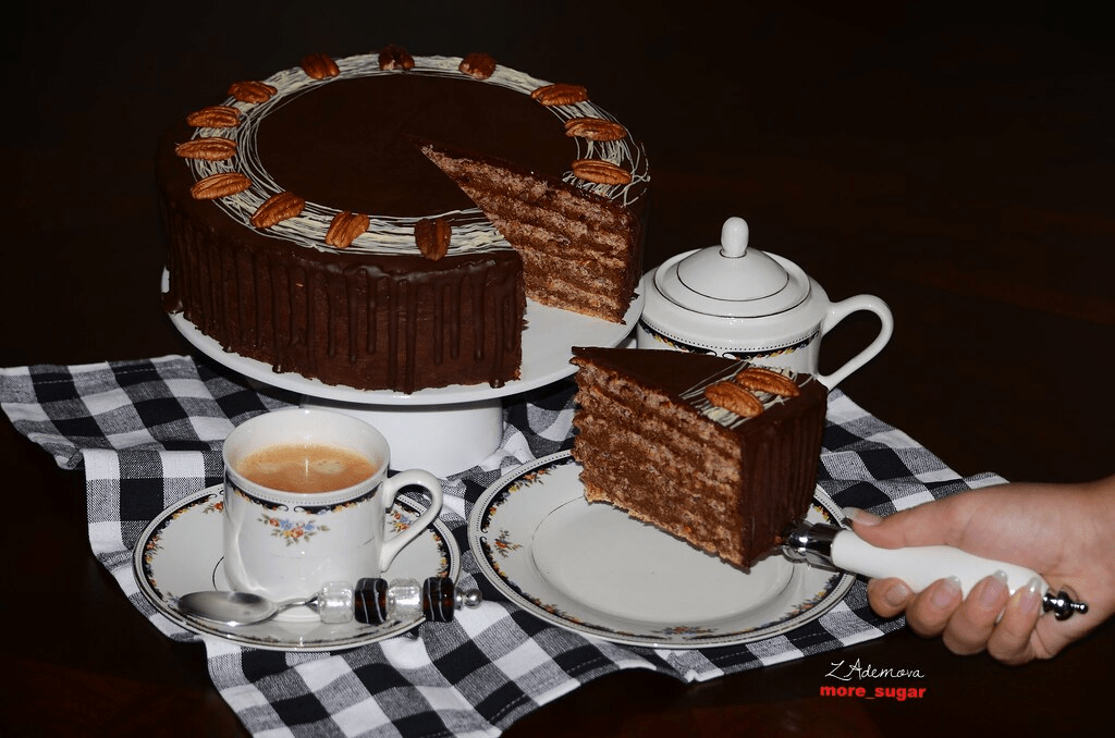 Cukierniczy symbol Kijowa. Powstał w fabryce cukierniczej im. Karola Marksa, z której wyrosła słynna ukraińska firma cukiernicza Roshen (podobno mieszkańcy Kijowa żartują sobie czasem, że Marks był wielkim cukiernikiem), według legendy – podobnie jak nasze ulubione tarta tatin, naleśniki suzette czy lody na patyku – przez pomyłkę. Ponoć pewnego wieczora cukiernicy zapomnieli schować do lodówki białek, których używali zazwyczaj do biszkoptów; kiedy kierownik odkrył błąd, postanowił „uratować” lekko zakwaszone białka i upiekł z nich bezowe blaty, które następnie przełożył maślanym kremem i udekorował kwiatowym wzorem. Oficjalna wersja mówi jednak o licznych eksperymentach, które w 1956 roku doprowadziły do opracowania receptury na bezowo-orzechowe blaty, przekładane kremem i do dzisiaj sprzedawane w takich samych pudełkach z liśćmi kasztanowca.